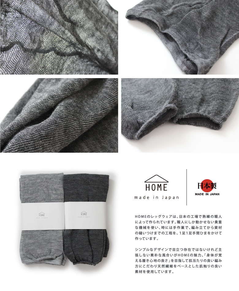 『HOME』はシンプルで心地良いレッグウェアを作りたいという想いと、日本人の職人の高い技術力を一番活かせる「履き心地」へのこだわりをコンセプトに立ち上げた、日本製の素朴なレッグウェアブランドです。